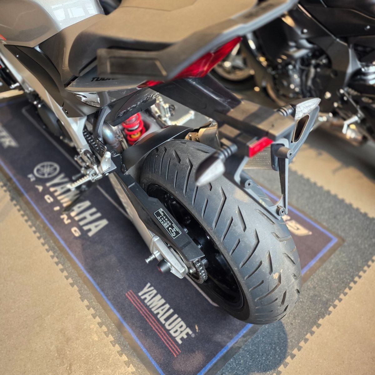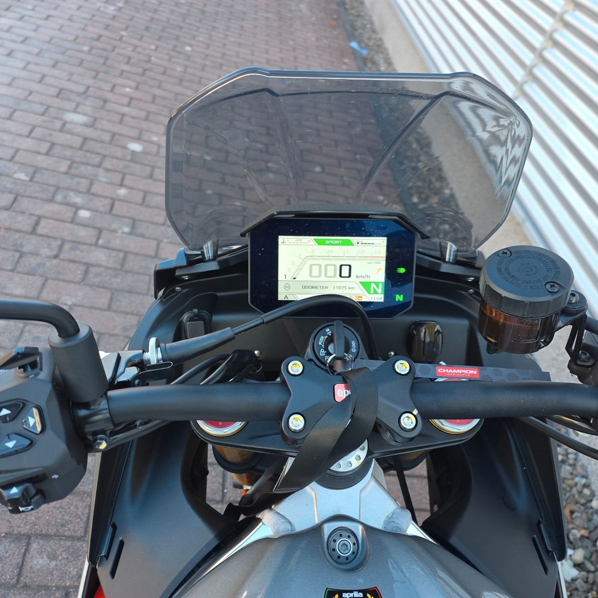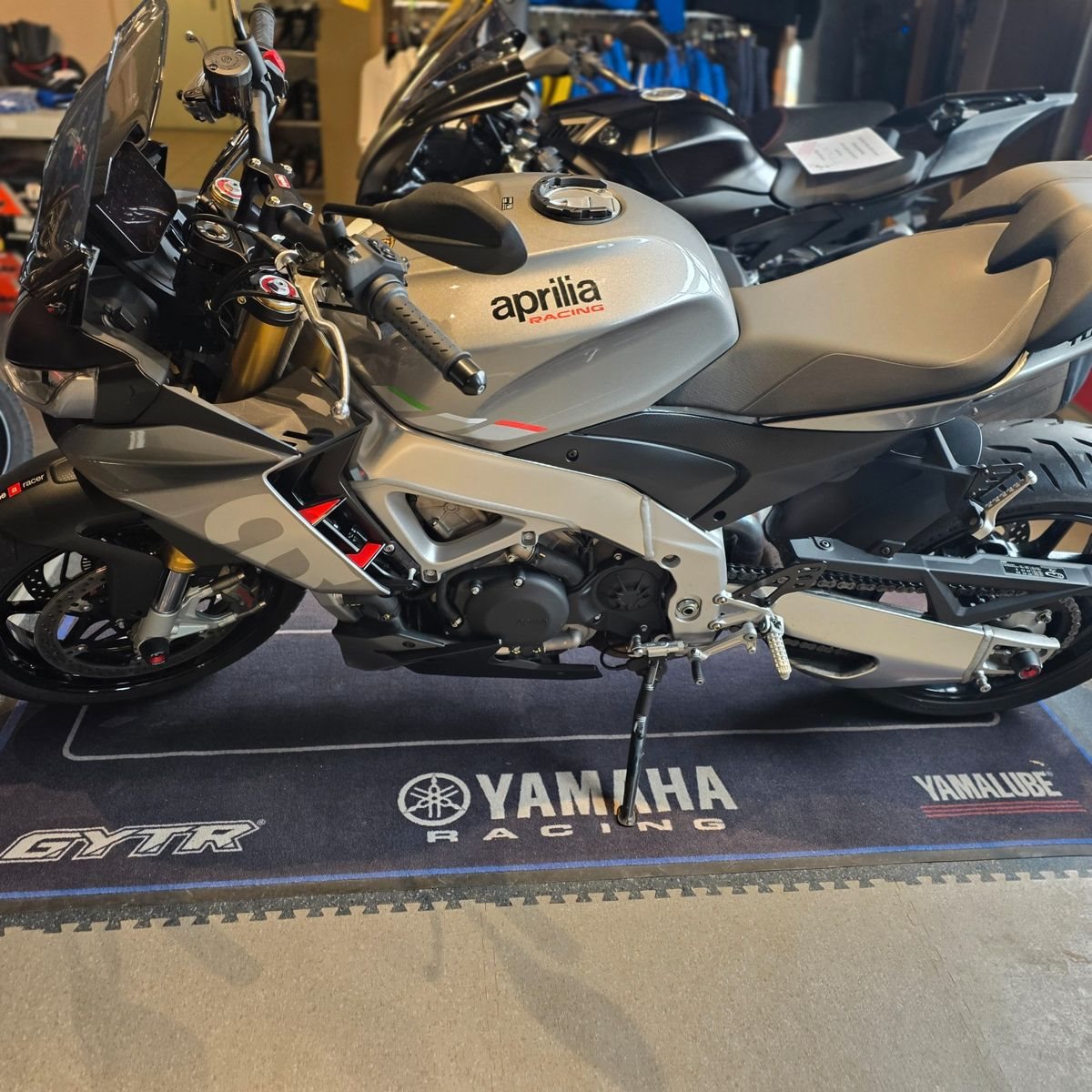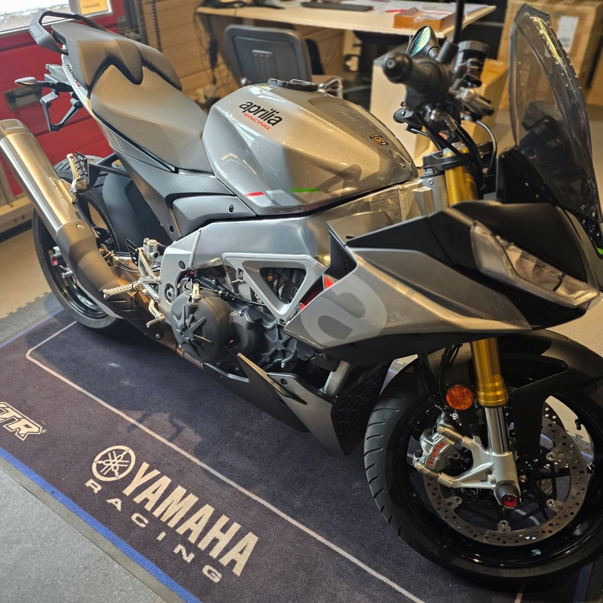 >> Aprilia Sozius-Fußrasten-Ausführung von der Factory-Version umgerüstet, die Rasten sitzen höher haben dadurch mehr Abstand zu den Fahrer-Fußrasten